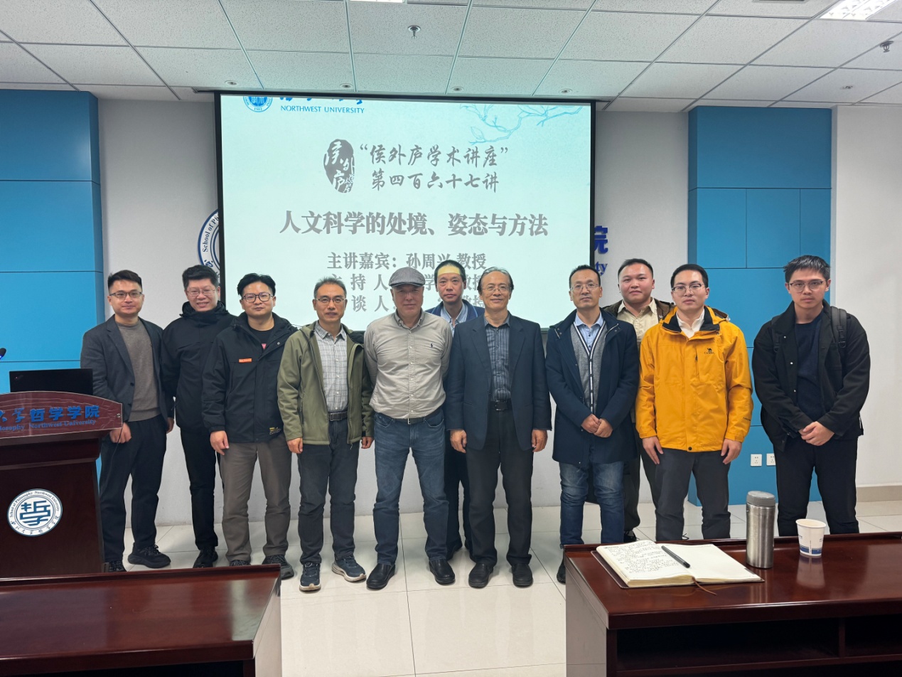 11月14日下午,浙江大学未来哲学研究院院长孙周兴教授应邀做客西北大学“侯外庐学术讲座”第四百六十七讲,作题为“人文科学的处境、姿态与方法”的专题讲座,哲学学院师生50余人参加了讲座。讲座由西北大学哲学学院院长张学广教授主持,西北大学哲学学院副院长刘宇教授进行与谈。