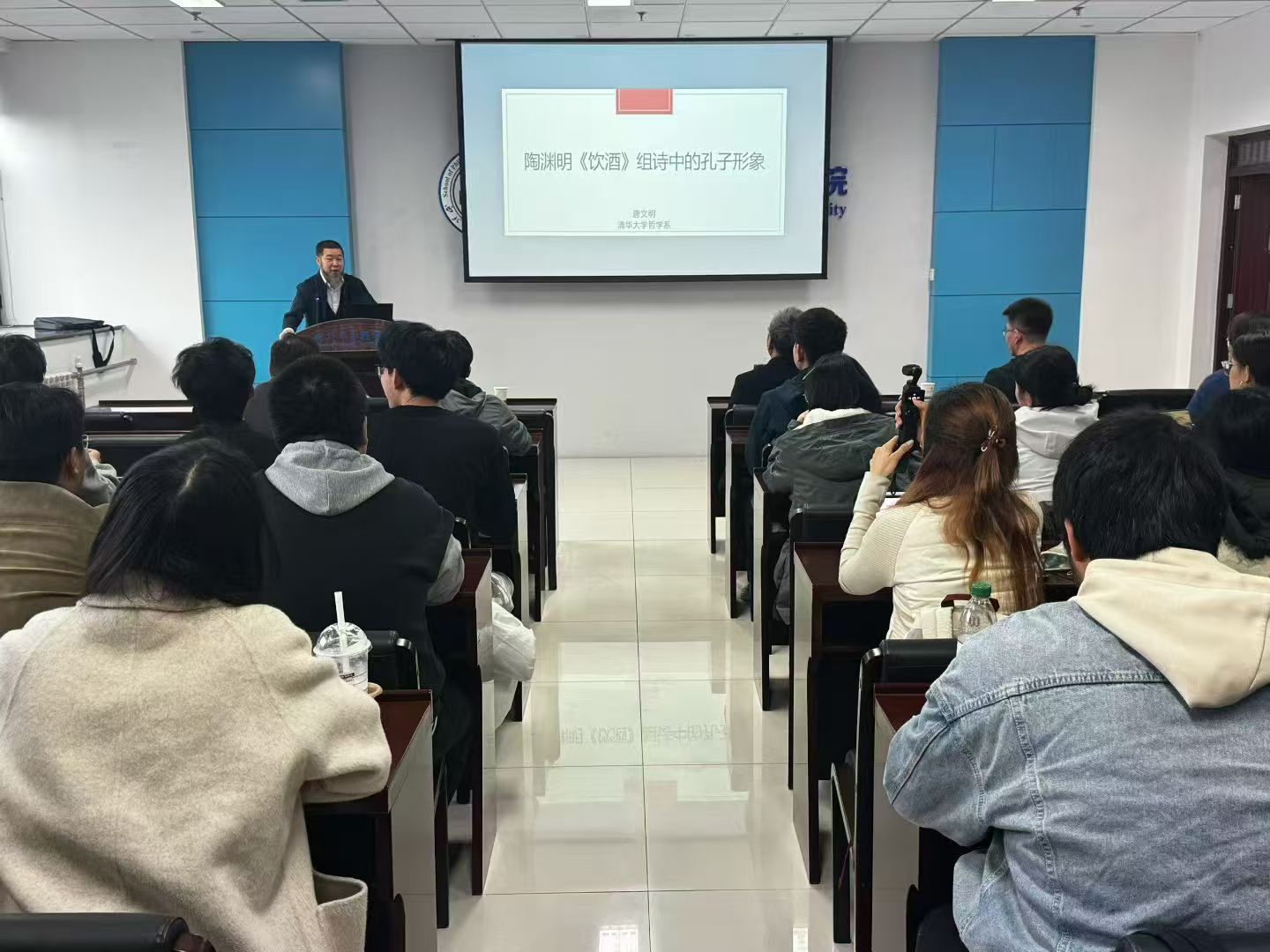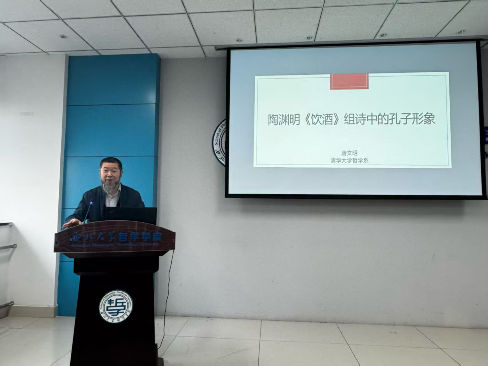 2025年11月15日下午,清华大学哲学系主任唐文明教授应邀做客西北大学“名家讲坛”,在长安校区哲学学院会议室以“陶渊明《饮酒》组诗中的孔子形象”为题,为在场师生带来了一场深邃而富有启发的学术报告。讲座由西北大学哲学学院张学广教授主持,魏冬教授担任与谈人。