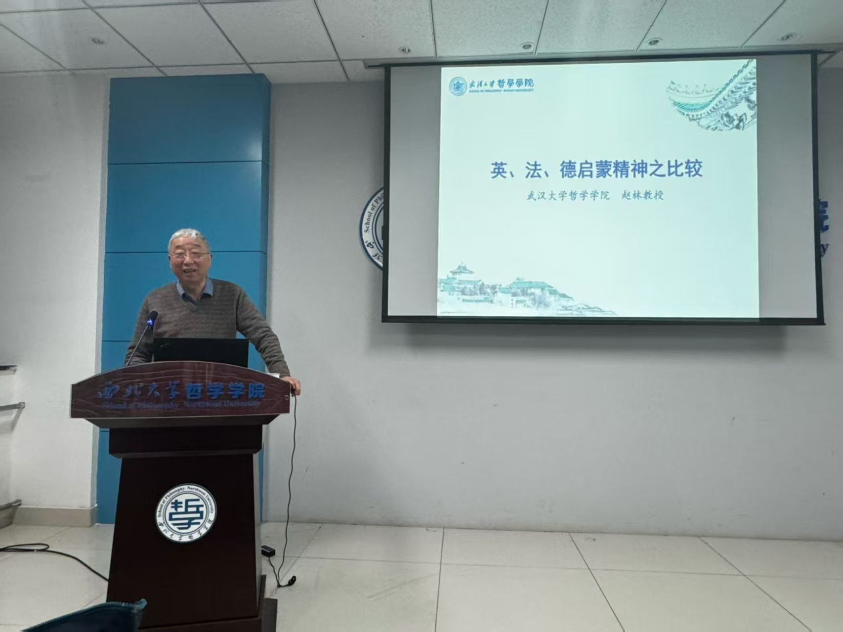11月17日晚,国家教学名师、澳门科技大学特聘教授赵林老师应邀做客西北大学“名家讲坛”,作题为“英、法、德启蒙精神之比较”的专题讲座。本次讲座由西北大学哲学学院院长张学广教授主持,西北大学哲学学院青年教师李艳博士进行与谈。讲座现场座无虚席,气氛热烈,赵林教授充满激情与智慧的讲解获得了师生们的高度赞誉。