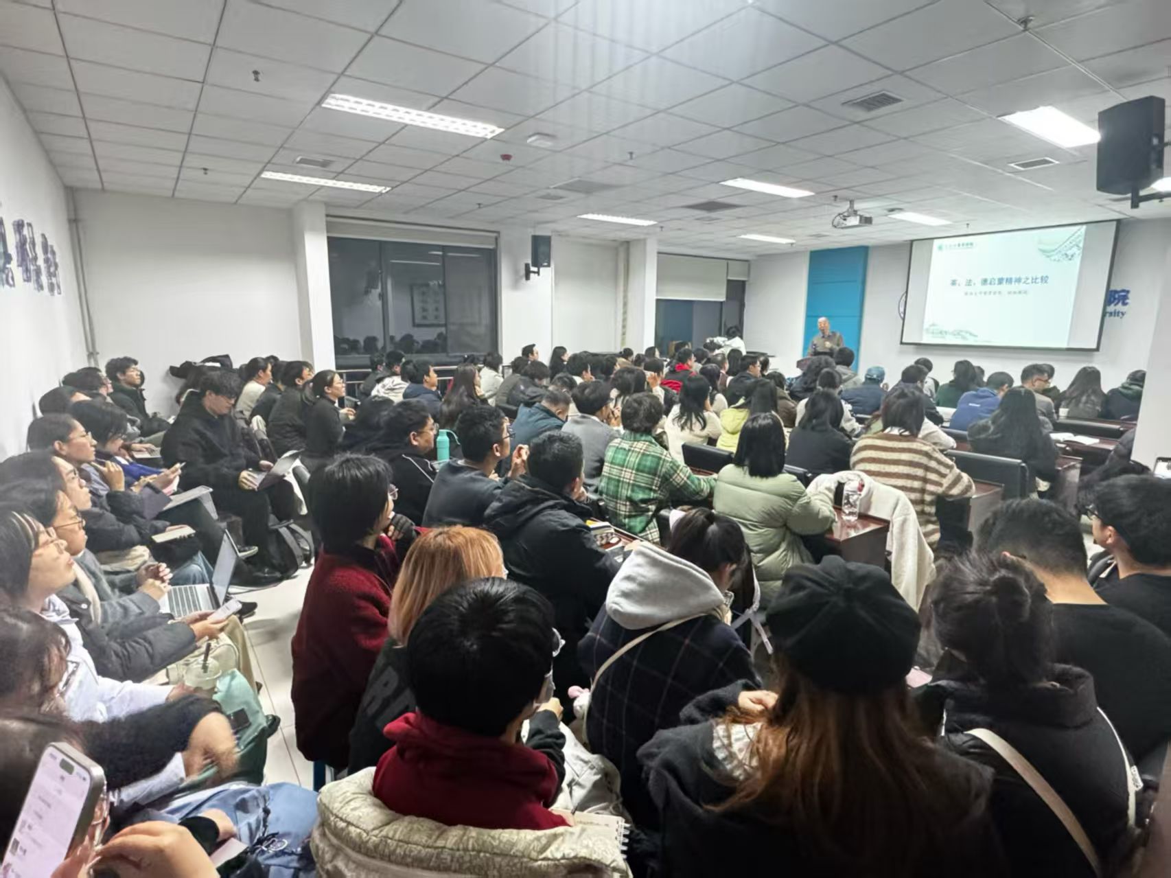赵林教授充满激情与智慧的讲解深深吸引了每一位听众。在两个多小时的演讲中,与会师生全神贯注,仿佛进行了一场穿越时空的精神漫游。讲座结束后,李艳博士总结道,这场讲座“高屋建瓴、精彩绝伦”,赵老师以其标志性的“深入浅出”的语言魅力,将复杂深邃的欧洲思想史脉络清晰地呈现在大家面前,既有历史的宏大叙事,又不乏生动的细节,让在场所有人都享受了一场思想的盛宴。张院长在最后的总结陈词中高度评价了本场讲座。他指出,赵老师的讲解不仅梳理了历史,更重要的是为我们反思不同现代化道路提供了极具当代价值的视角。他进一步阐发道,中国在现代化进程中,更多地借鉴了欧陆模式,而对“宽容、温和又可靠”的英美模式吸收较少,这为我们留下了深刻的思考。最后,他感召在场的师生,认为赵教授的讲座是“把光交给了大家”,并鼓励所有人“把光带回去,照亮周围,照亮我们自己”,将学术的启迪转化为思想的力量。