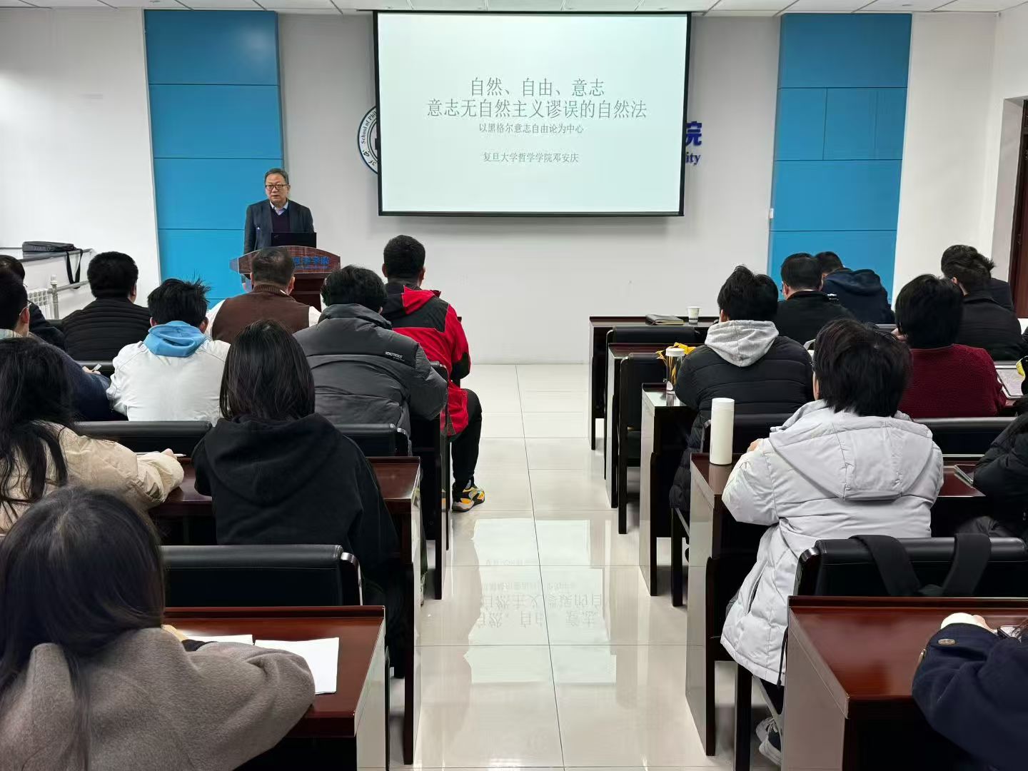 11月17日上午,复旦大学特聘教授,中国伦理学会副会长邓安庆教授受邀做客“侯外庐学术讲座”第四百七十二讲,开展了一场题为“自然、意志与自由:论一种没有自然主义谬误的自然法”的专题讲座。本次讲座由西北大学哲学学院院长张学广教授主持,西北大学哲学学院副院长胡军良教授进行与谈,哲学学院50余名师生参与。